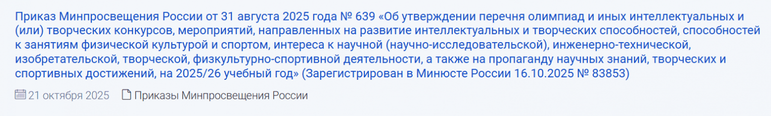 Приказ Министерства просвещения Российской Федерации от 31.08.2025 № 639 «Об утверждении перечня олимпиад и иных интеллектуальных и (или) творческих конкурсов, мероприятий, направленных на развитие интеллектуальных и творческих способностей, способностей к занятиям физической культурой и спортом, интереса к научной (научно-исследовательской), инженерно-технической, изобретательской, творческой, физкультурно-спортивной деятельности, а также на пропаганду научных знаний, творческих и спортивных достижений, на 2025/26 учебный год» (Зарегистрирован 16.10.2025 № 83853)